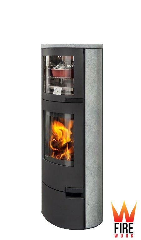 - Радиальная стеклянная дверца духового шкафа гармонируют с дизайном камина