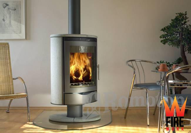 Kаминная печь STROMBOLI с облицовкой из природного камня, который, как и керамика, природный материал с аккумулирующими свойствами, продолжает передавать излучаемое тепло и после угасания огня в топке.