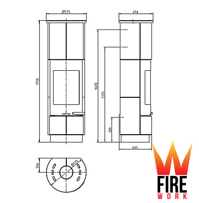 Размеры (мм): 1737*530*465 (в*ш*г)Объем помещения (м³): 98 - 124Тепловая мощность, кВт: 7.5КПД, %: 80Дымоход (мм): 150 (диаметр)Вес, кг: 135Цвет корпуса : черный/керамика слоновая кость