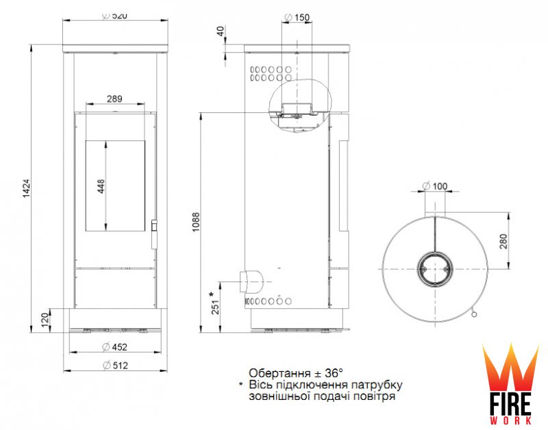 - Вертикальний або горизонтальний димохідний патрубок D - 150мм